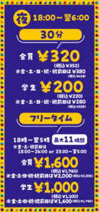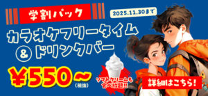 カラオケ料金 2023.10.212025.10.10 お一人様料金(税込) ※ワンドリンク制(室料とは別に、ワンドリンクorドリンクバーorアルコールバーor飲み放題のいずれかをご注文ください) ※お盆シーズンや年末年始などは料金が変更になる場合がございます。詳しくは店舗までお気軽にお問い合わせください。